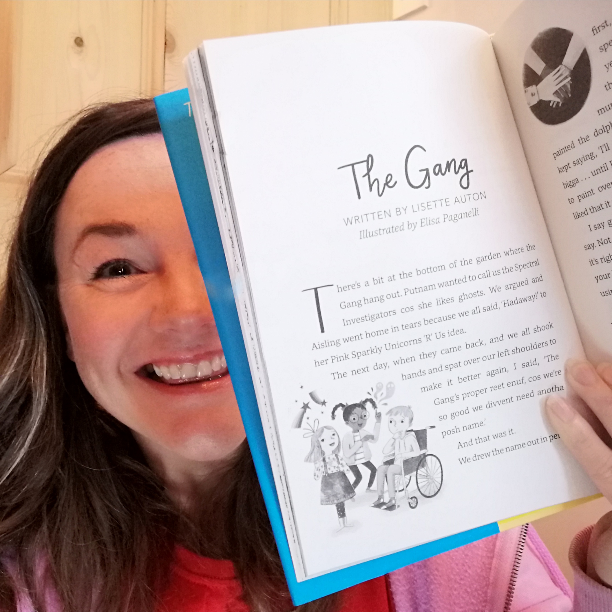 image description: Lisette grins to the point her face may fall off, and holds The Puffin Book of Big Dreams open at her story – The Gang. Illustrated by Elisa Paganelli.