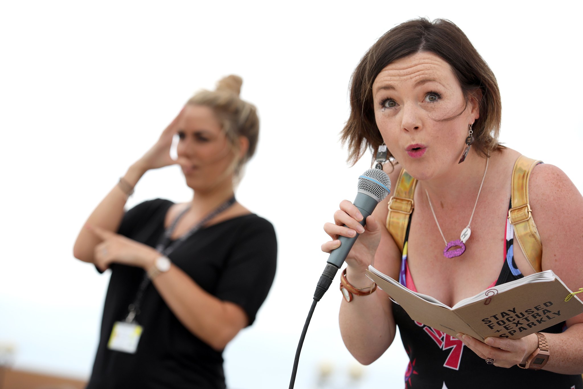 Lisette with mic and book saying ‘Stay Focused + Extra Sparkly’ pulling bizarre faces on a festival stage with comic book dress and gold hologram backpack.